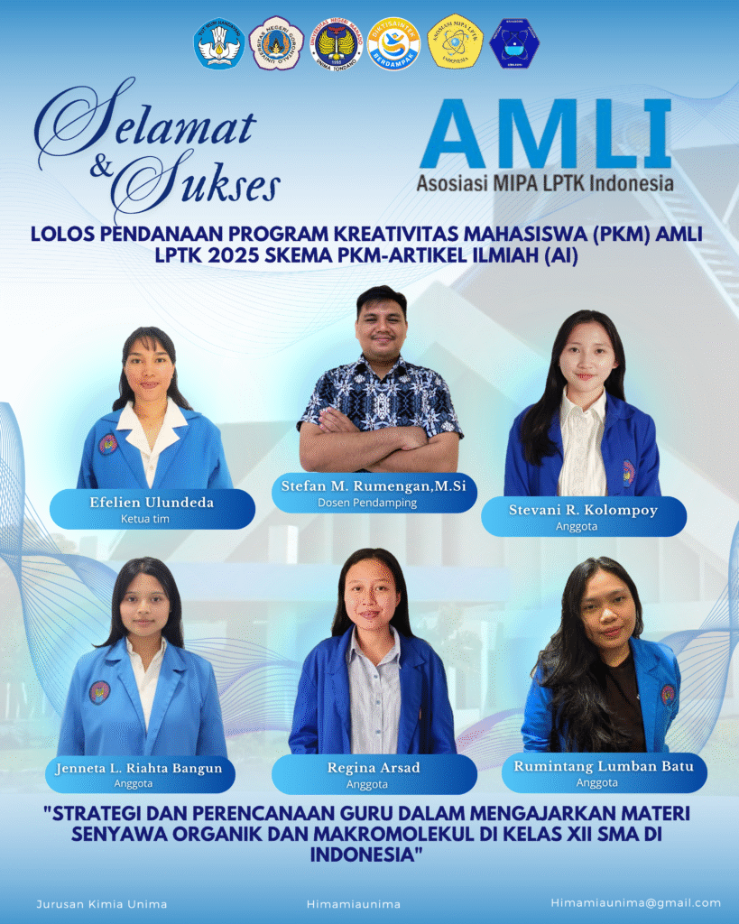Hampir seluruh peserta PKM AMLI dan Belmawa dari Jurusan Kimia juga aktif sebagai pengurus organisasi mahasiswa baik di tingkat jurusan maupun fakultas. Hal ini menunjukkan bahwa mahasiswa Jurusan Kimia UNIMA mampu menyeimbangkan kegiatan akademik dan organisasi secara optimal. Capaian pada PKM AMLI 2025 menjadi bukti komitmen Jurusan Kimia dalam membina mahasiswa yang kreatif, berprestasi, dan siap bersaing di tingkat nasional.