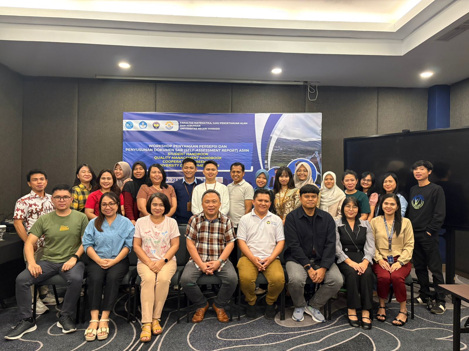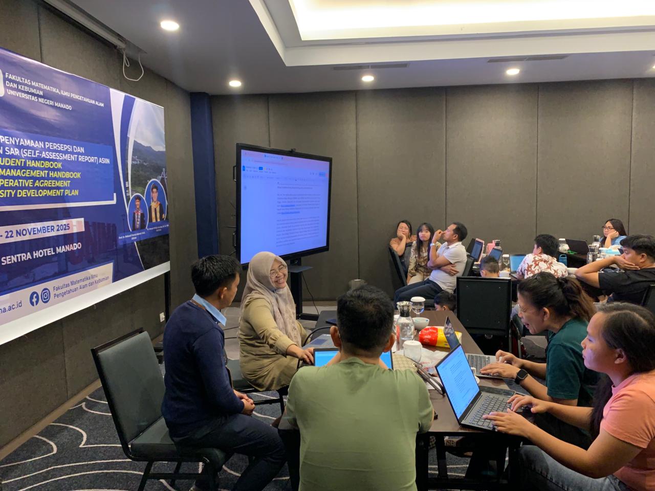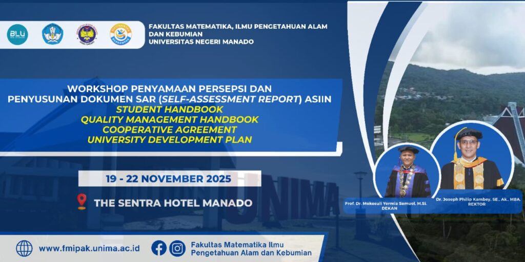 MANADO, 19-22 November 2025 – Fakultas Matematika, Ilmu Pengetahuan Alam, dan Kebumian (FMIPAK) Universitas Negeri Manado (UNIMA) sukses menyelenggarakan Workshop Penyamaman Persepsi dan Penyusunan Dokumen SAR (Self-Assessment Report) ASIIN. Kegiatan intensif yang berlangsung selama empat hari, mulai dari tanggal 19 hingga 22 November 2025 di The Sentra Hotel Manado, ini menjadi langkah strategis FMIPAK dalam mewujudkan standar mutu pendidikan internasional. Workshop ini berfokus pada penyamaan persepsi dan percepatan penyusunan berbagai dokumen kunci yang dipersyaratkan oleh ASIIN, seperti Student Handbook, Quality Management Handbook, Cooperative Agreement, dan University Development Plan.